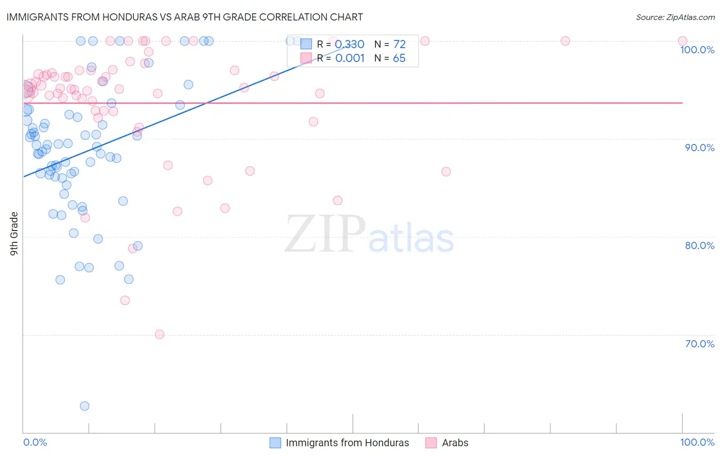 Immigrants from Honduras vs Arab 9th Grade Correlation Chart