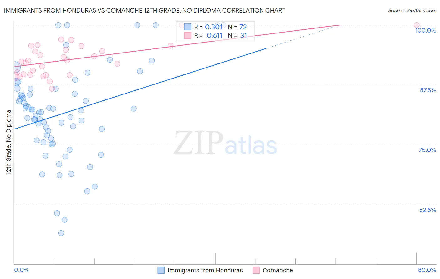 Immigrants from Honduras vs Comanche 12th Grade, No Diploma Correlation Chart