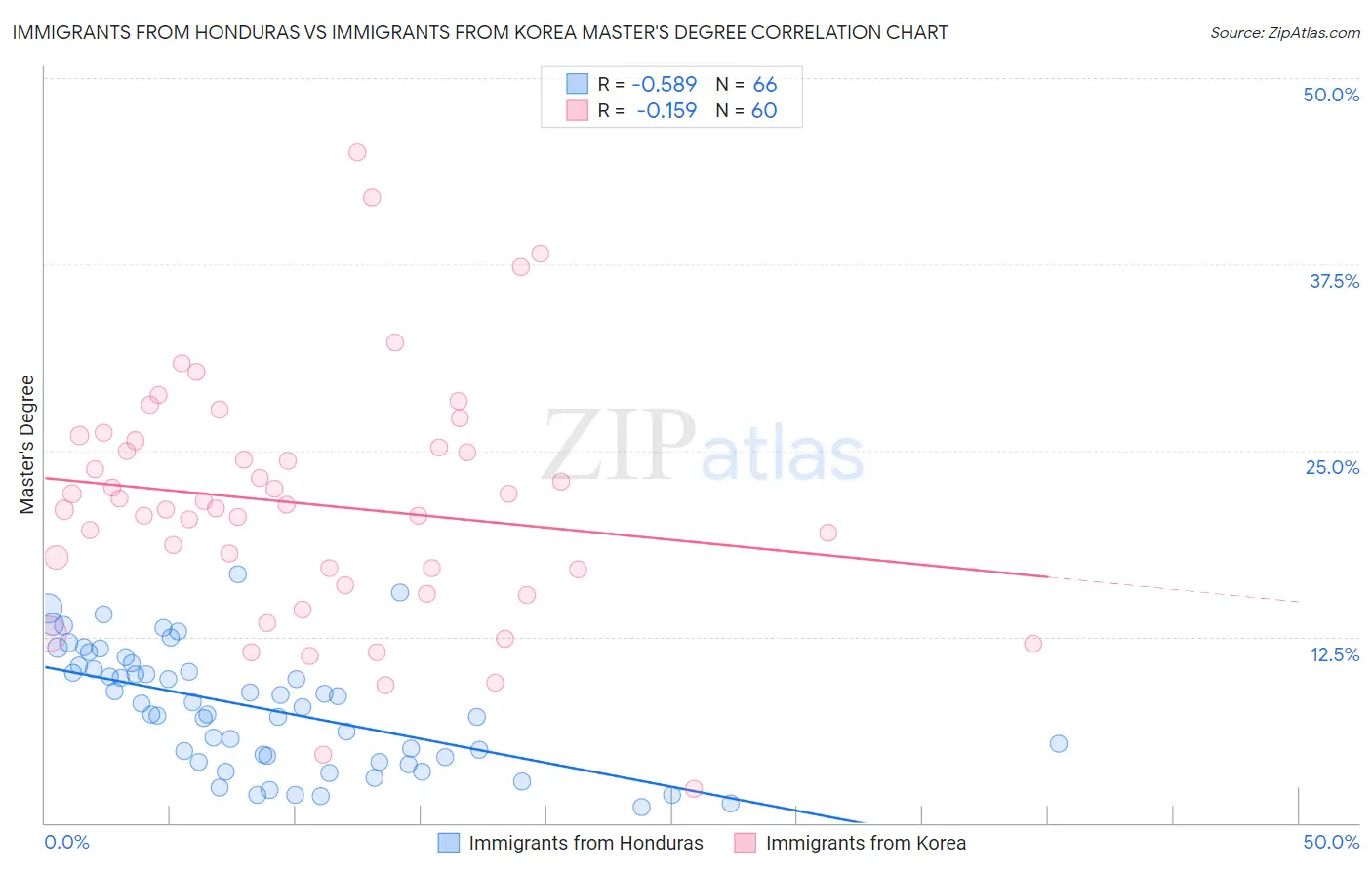 Immigrants from Honduras vs Immigrants from Korea Master's Degree Correlation Chart