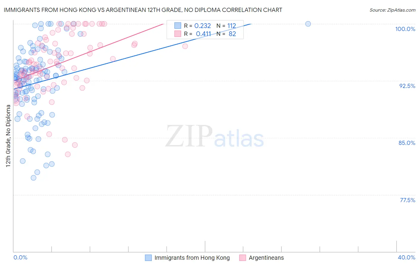 Immigrants from Hong Kong vs Argentinean 12th Grade, No Diploma Correlation Chart