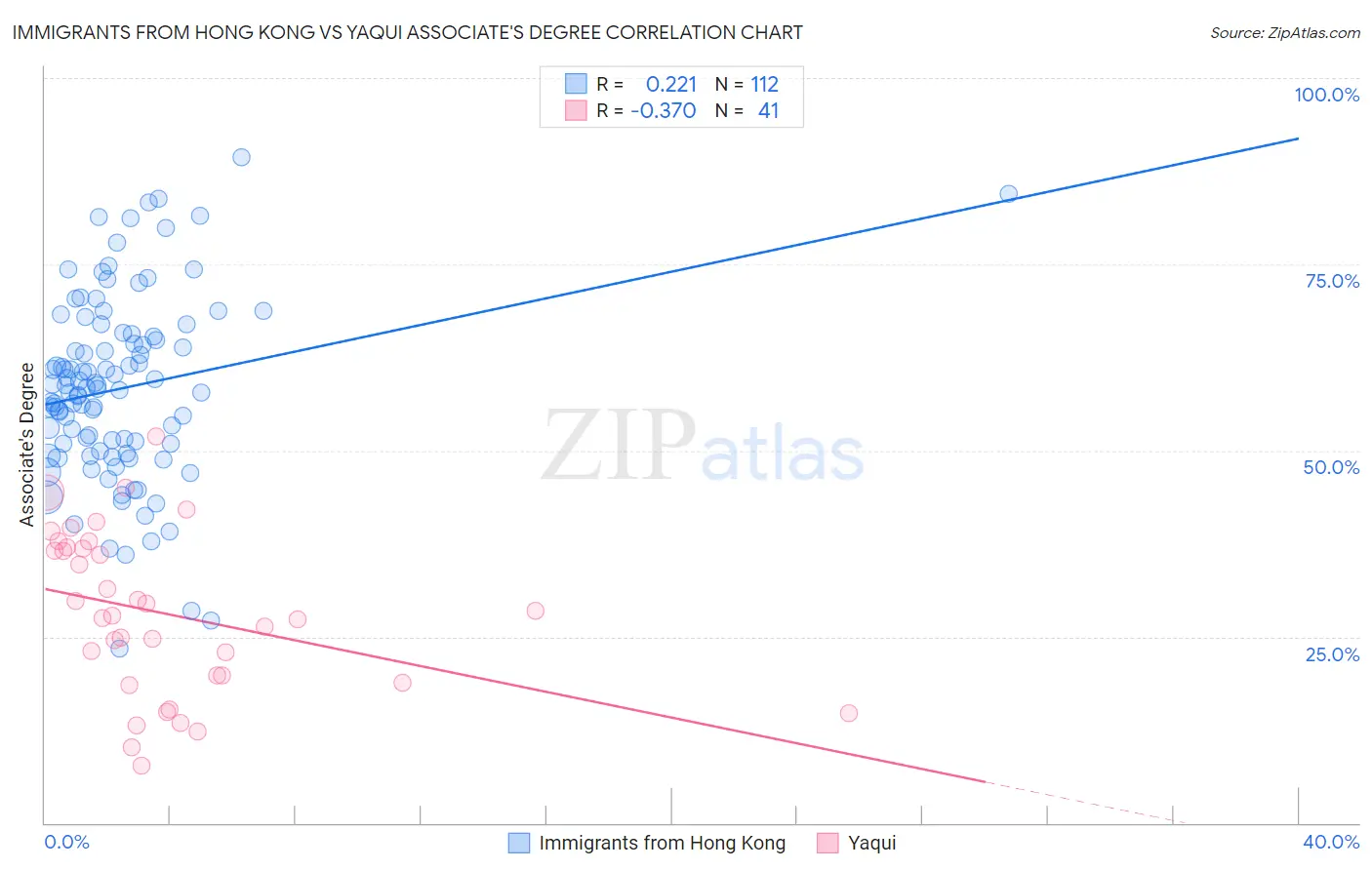 Immigrants from Hong Kong vs Yaqui Associate's Degree Correlation Chart