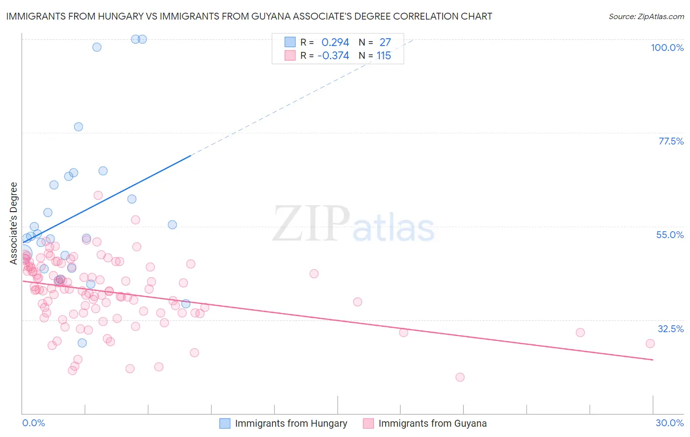 Immigrants from Hungary vs Immigrants from Guyana Associate's Degree Correlation Chart