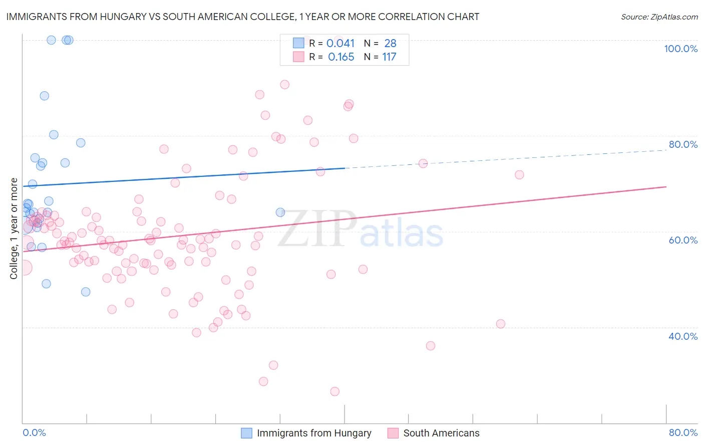 Immigrants from Hungary vs South American College, 1 year or more Correlation Chart