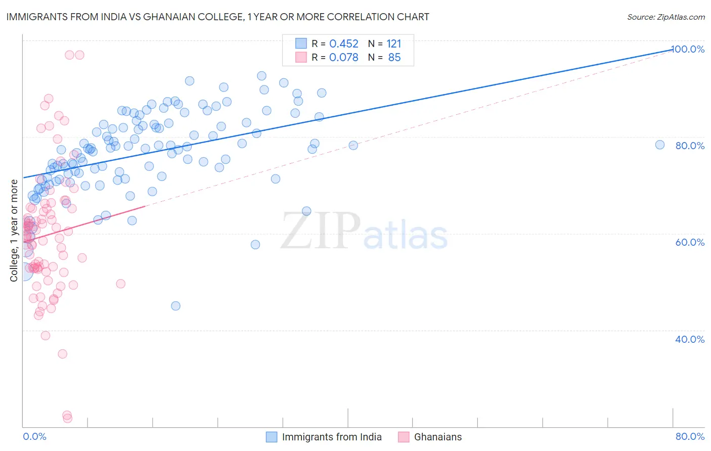Immigrants from India vs Ghanaian College, 1 year or more Correlation Chart