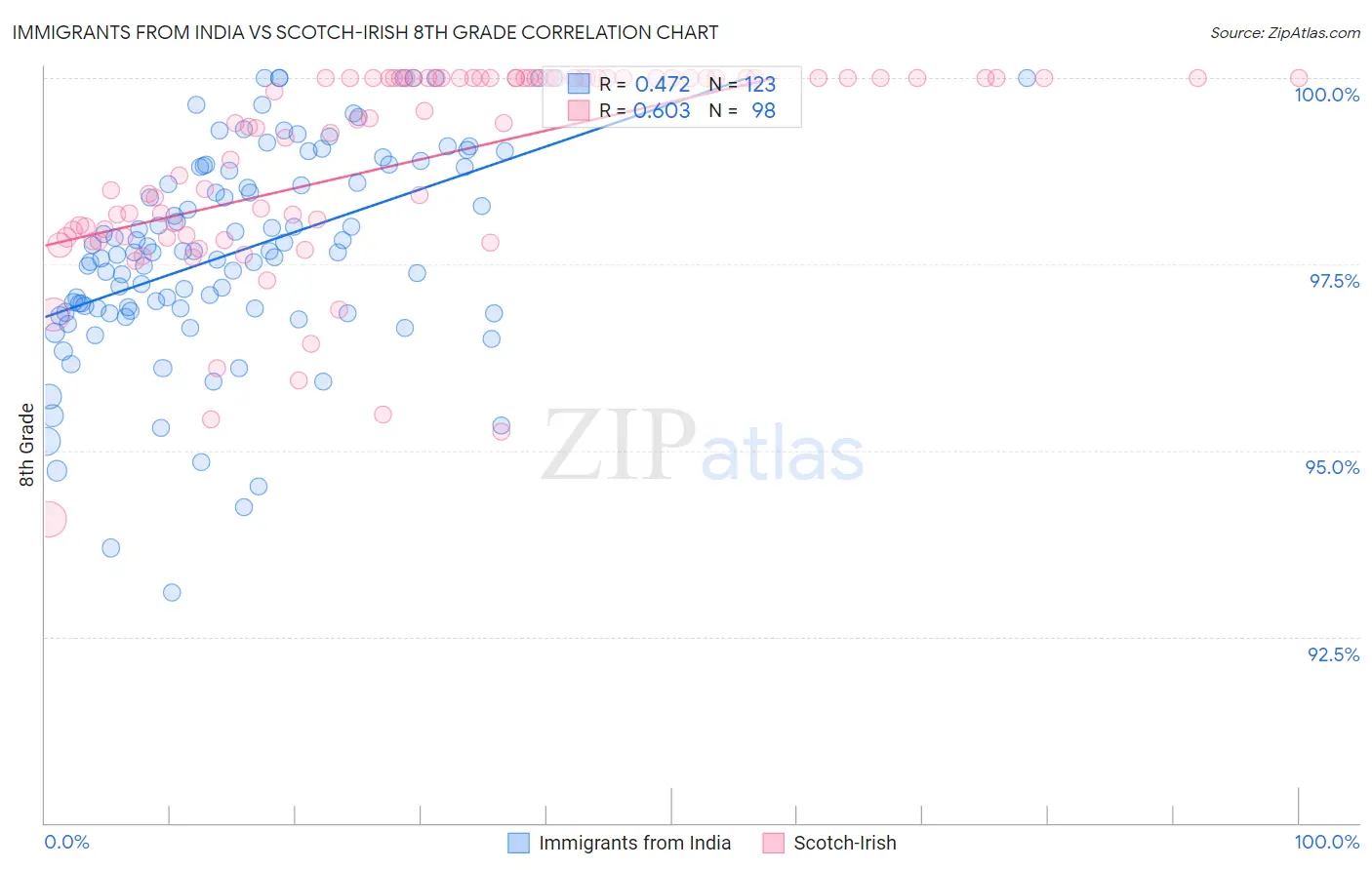 Immigrants from India vs Scotch-Irish 8th Grade Correlation Chart