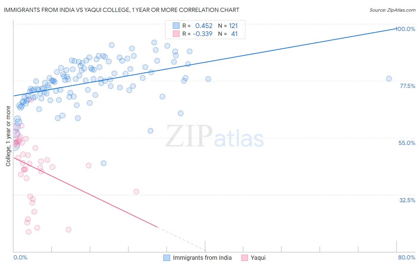 Immigrants from India vs Yaqui College, 1 year or more Correlation Chart