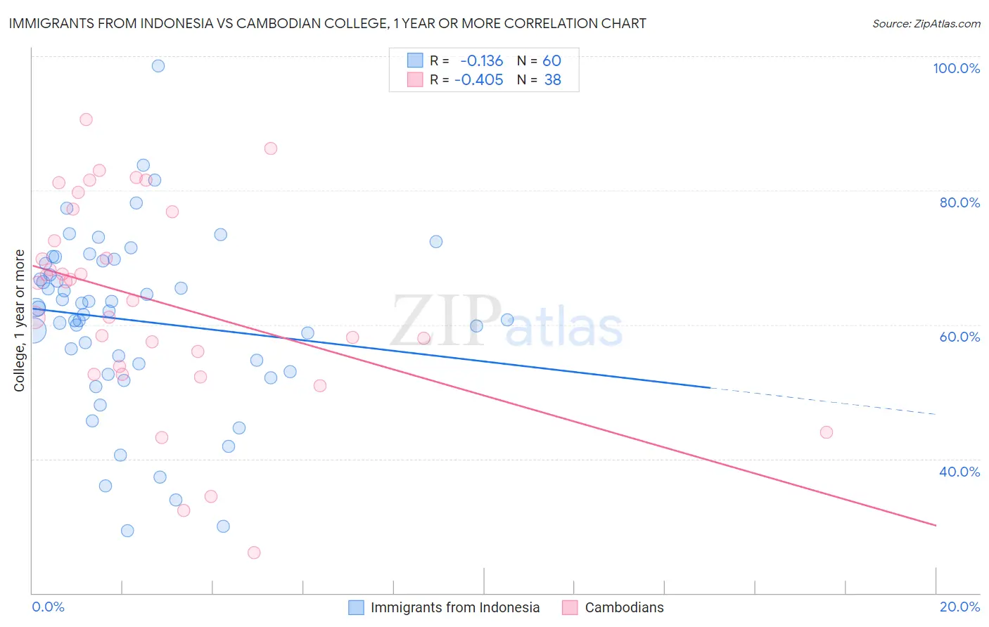 Immigrants from Indonesia vs Cambodian College, 1 year or more Correlation Chart