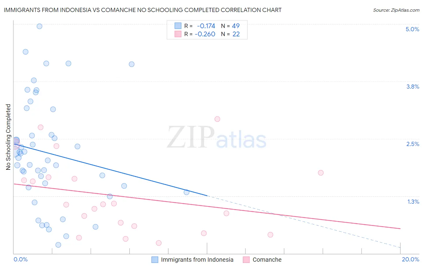 Immigrants from Indonesia vs Comanche No Schooling Completed Correlation Chart