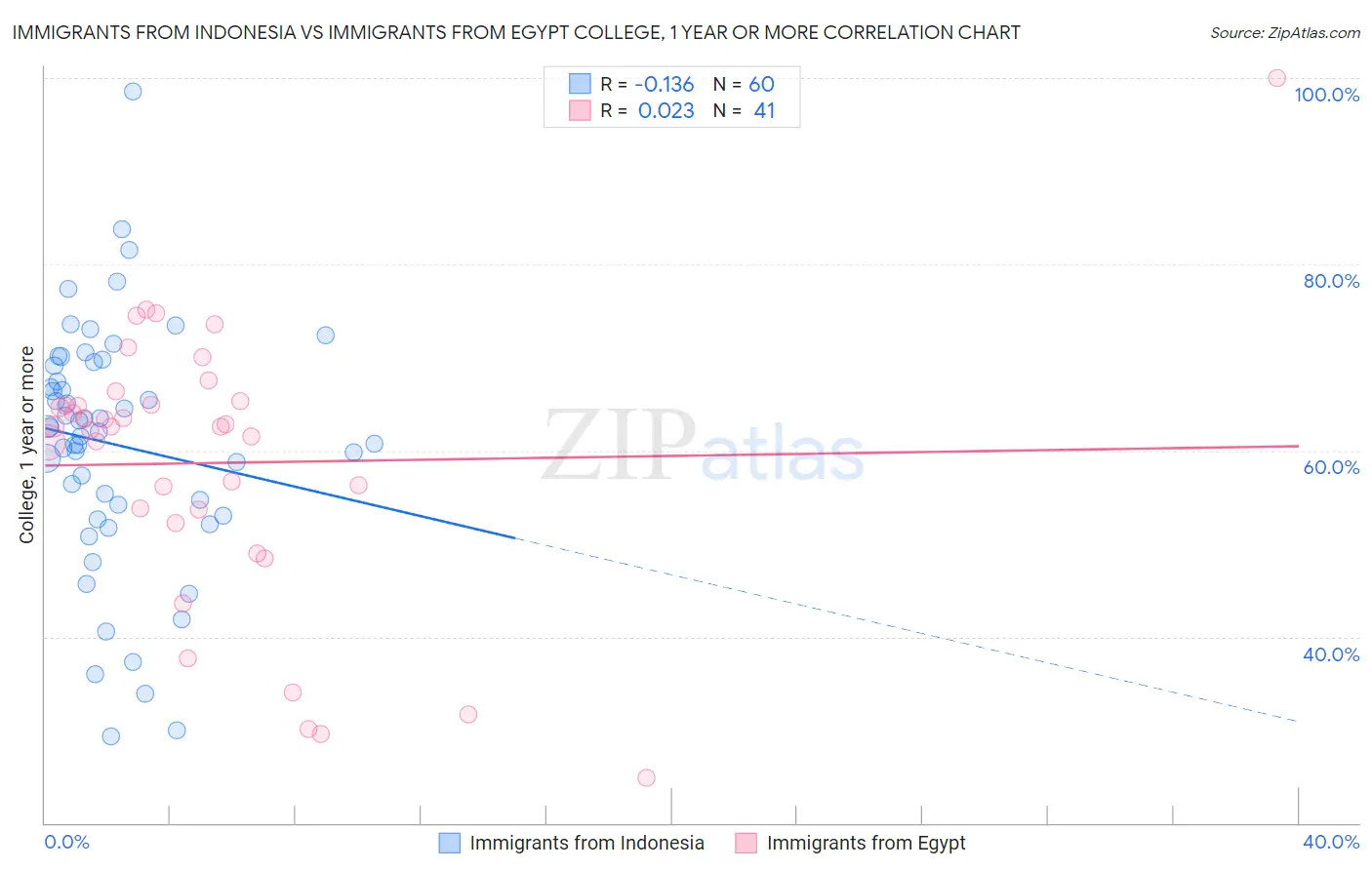 Immigrants from Indonesia vs Immigrants from Egypt College, 1 year or more Correlation Chart