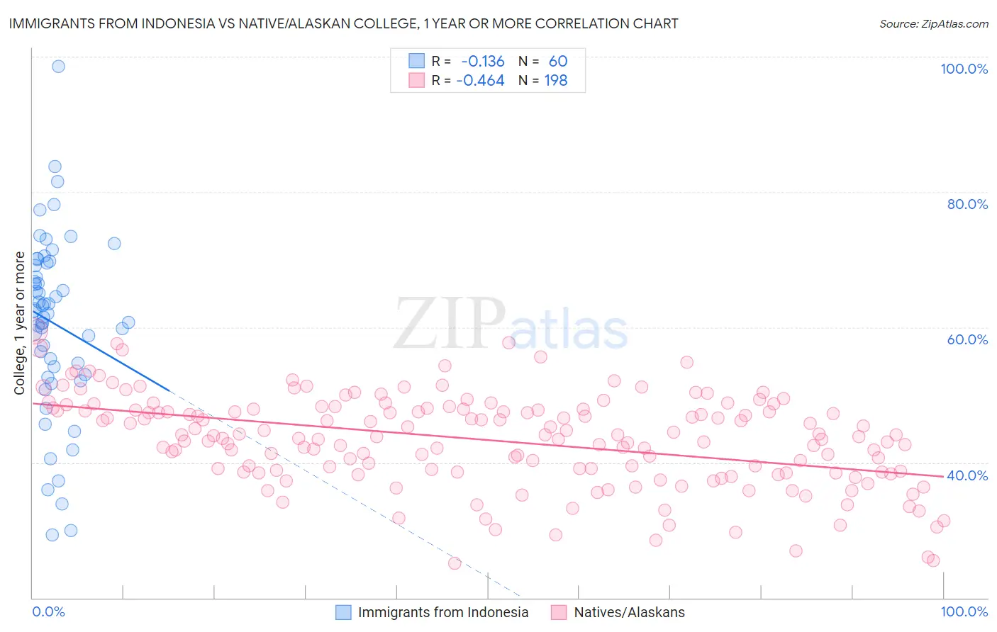 Immigrants from Indonesia vs Native/Alaskan College, 1 year or more