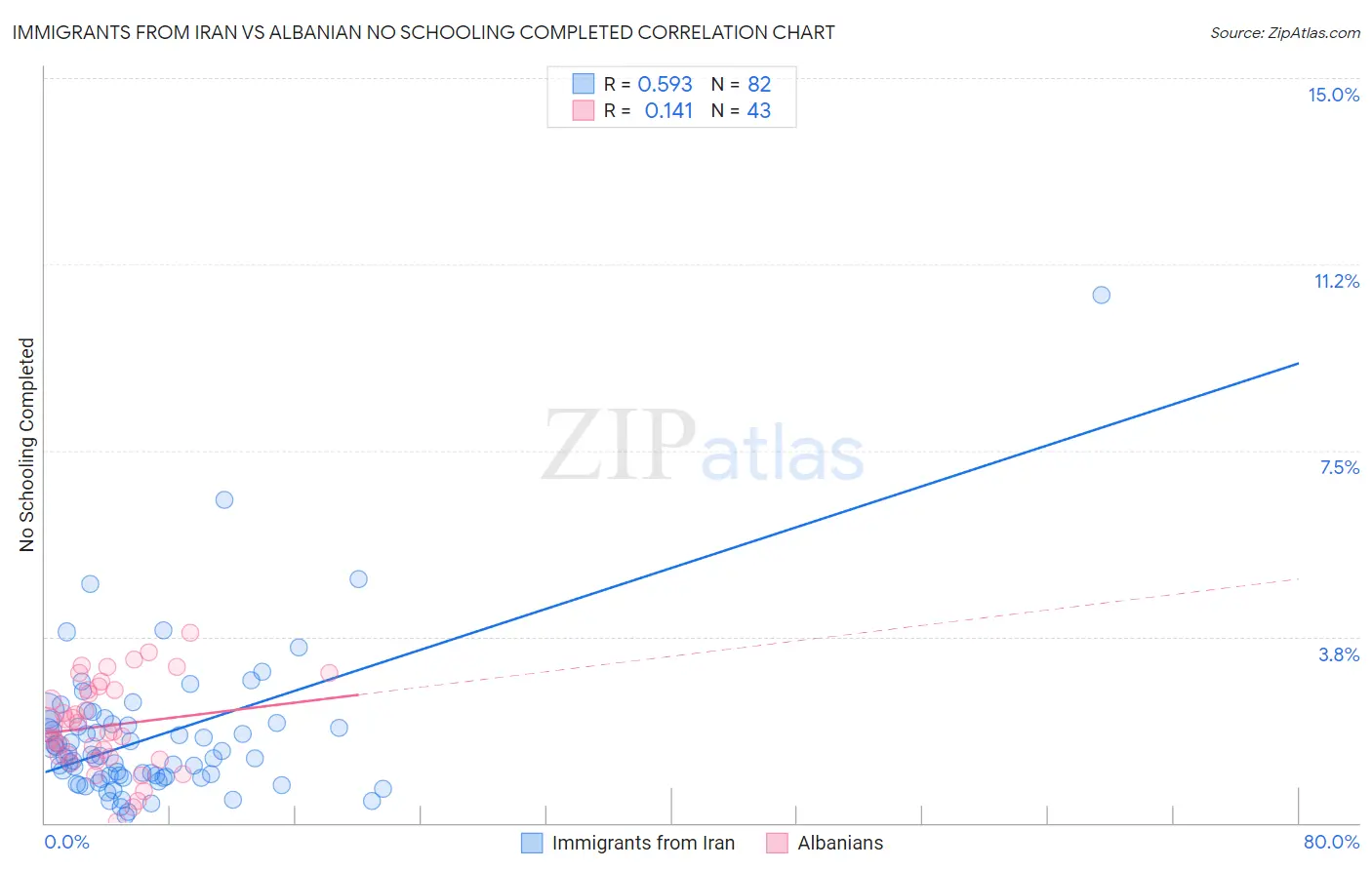 Immigrants from Iran vs Albanian No Schooling Completed Correlation Chart