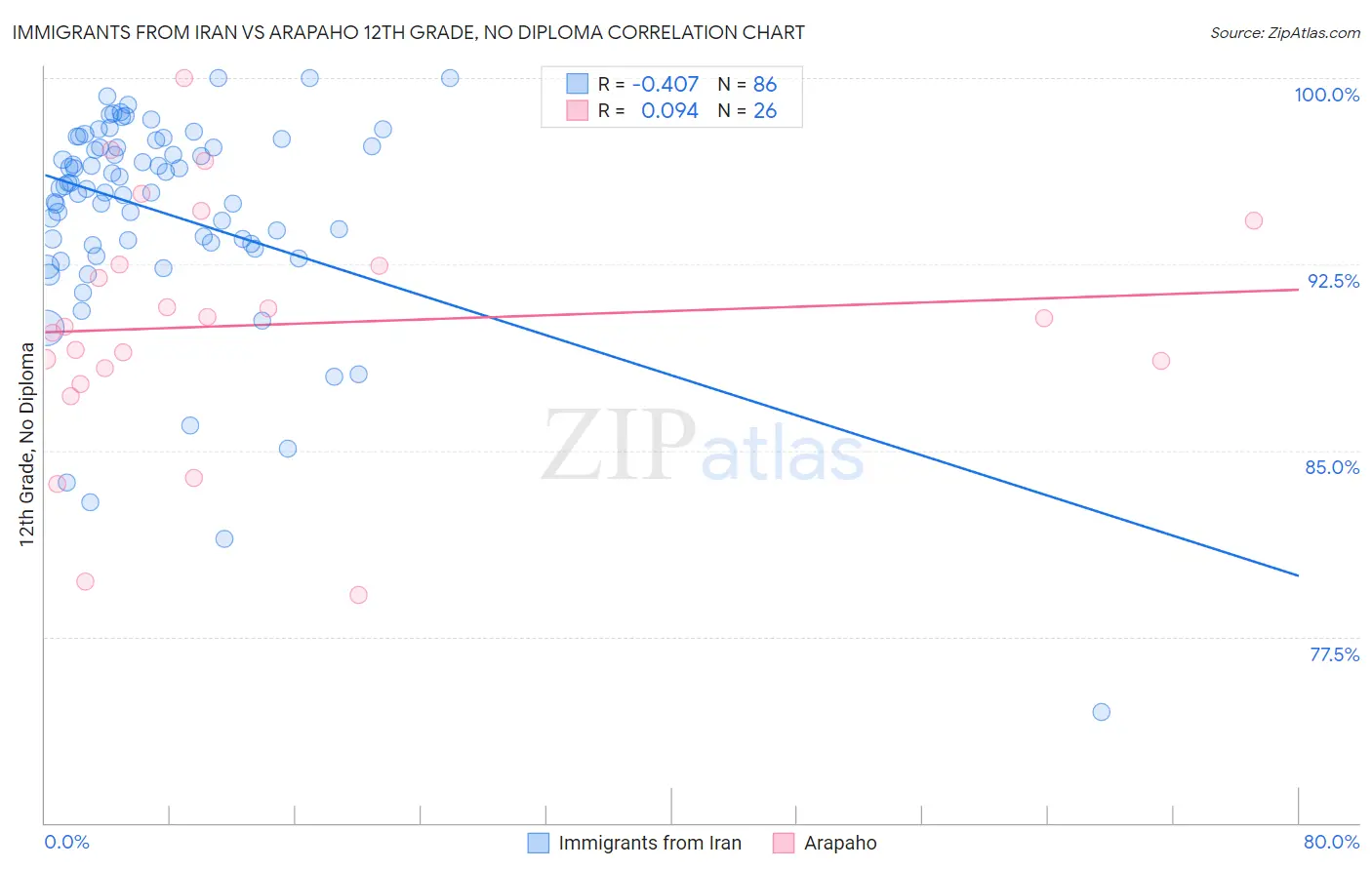 Immigrants from Iran vs Arapaho 12th Grade, No Diploma Correlation Chart