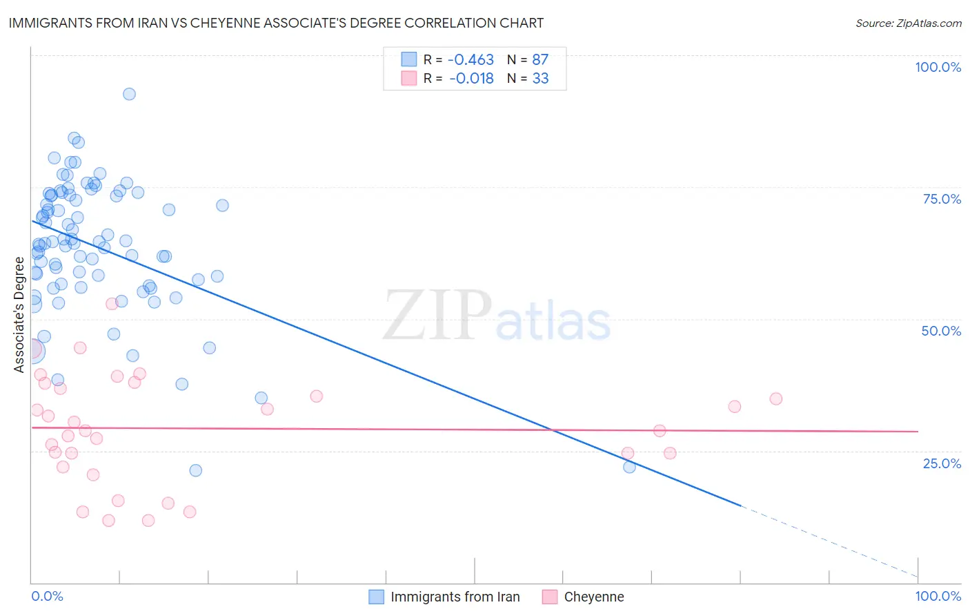 Immigrants from Iran vs Cheyenne Associate's Degree Correlation Chart