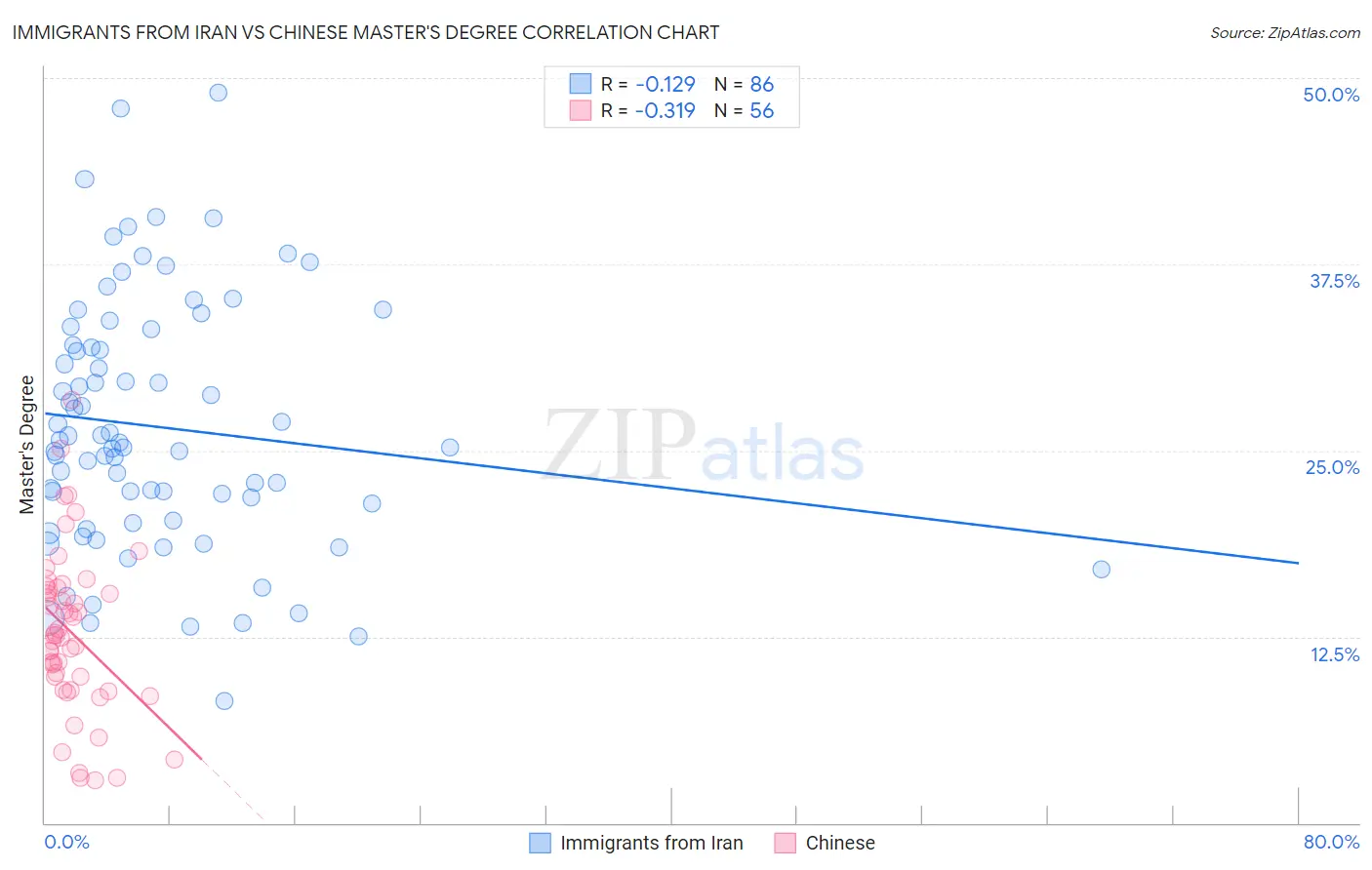 The statistical analysis conducted on geographies consisting of 279,879,707 people shows a poor negative correlation between the proportion of Immigrants from Iran and percentage of population with at least master's degree education in the United States with a correlation coefficient (R) of -0.129 and weighted average of 21.6%. Similarly, the statistical analysis conducted on geographies consisting of 64,806,468 people shows a mild negative correlation between the proportion of Chinese and percentage of population with at least master's degree education in the United States with a correlation coefficient (R) of -0.319 and weighted average of 14.6%, a difference of 48.4%.