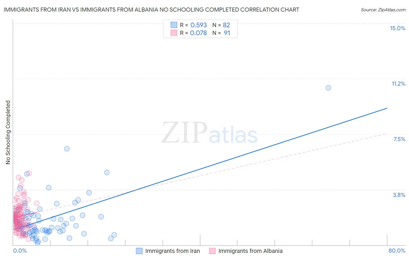 Immigrants from Iran vs Immigrants from Albania No Schooling Completed Correlation Chart