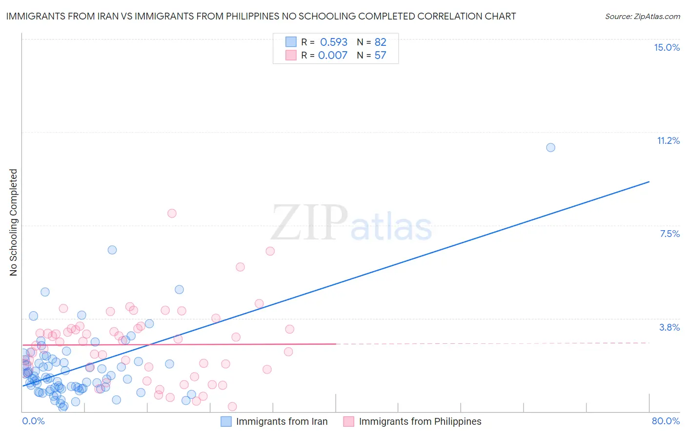 Immigrants from Iran vs Immigrants from Philippines No Schooling Completed Correlation Chart