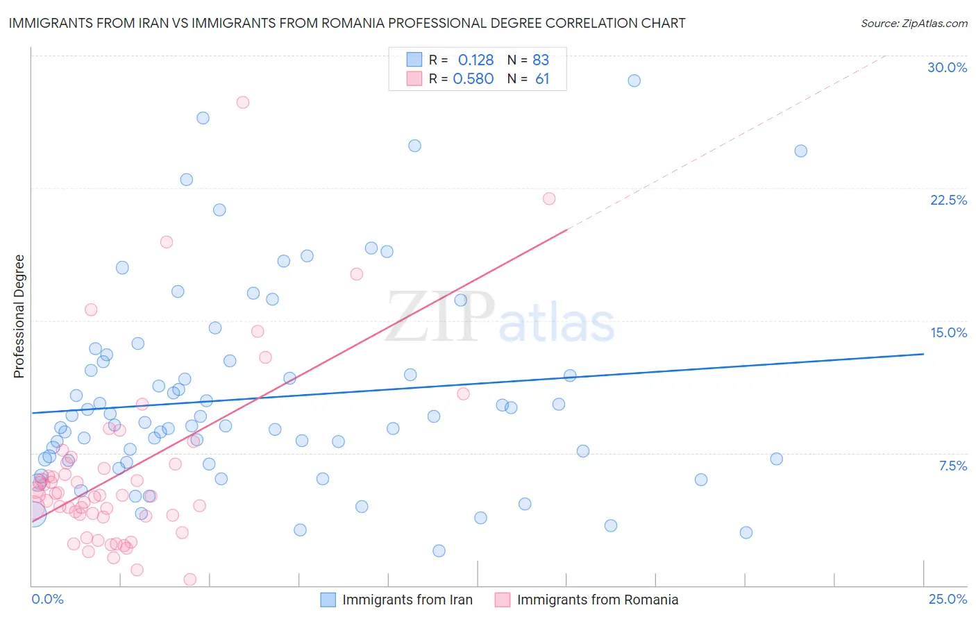 Immigrants from Iran vs Immigrants from Romania Professional Degree Correlation Chart