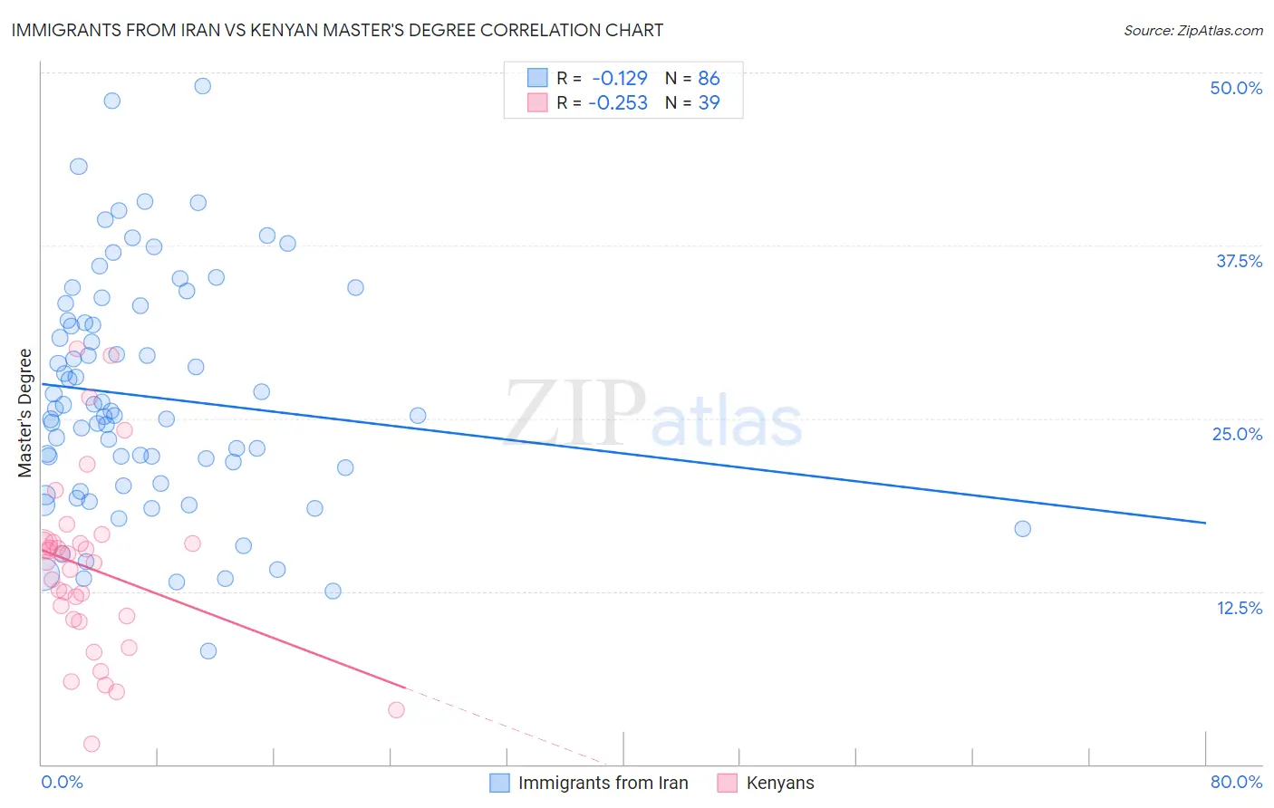 The statistical analysis conducted on geographies consisting of 279,879,707 people shows a poor negative correlation between the proportion of Immigrants from Iran and percentage of population with at least master's degree education in the United States with a correlation coefficient (R) of -0.129 and weighted average of 21.6%. Similarly, the statistical analysis conducted on geographies consisting of 168,212,419 people shows a weak negative correlation between the proportion of Kenyans and percentage of population with at least master's degree education in the United States with a correlation coefficient (R) of -0.253 and weighted average of 15.3%, a difference of 41.0%.