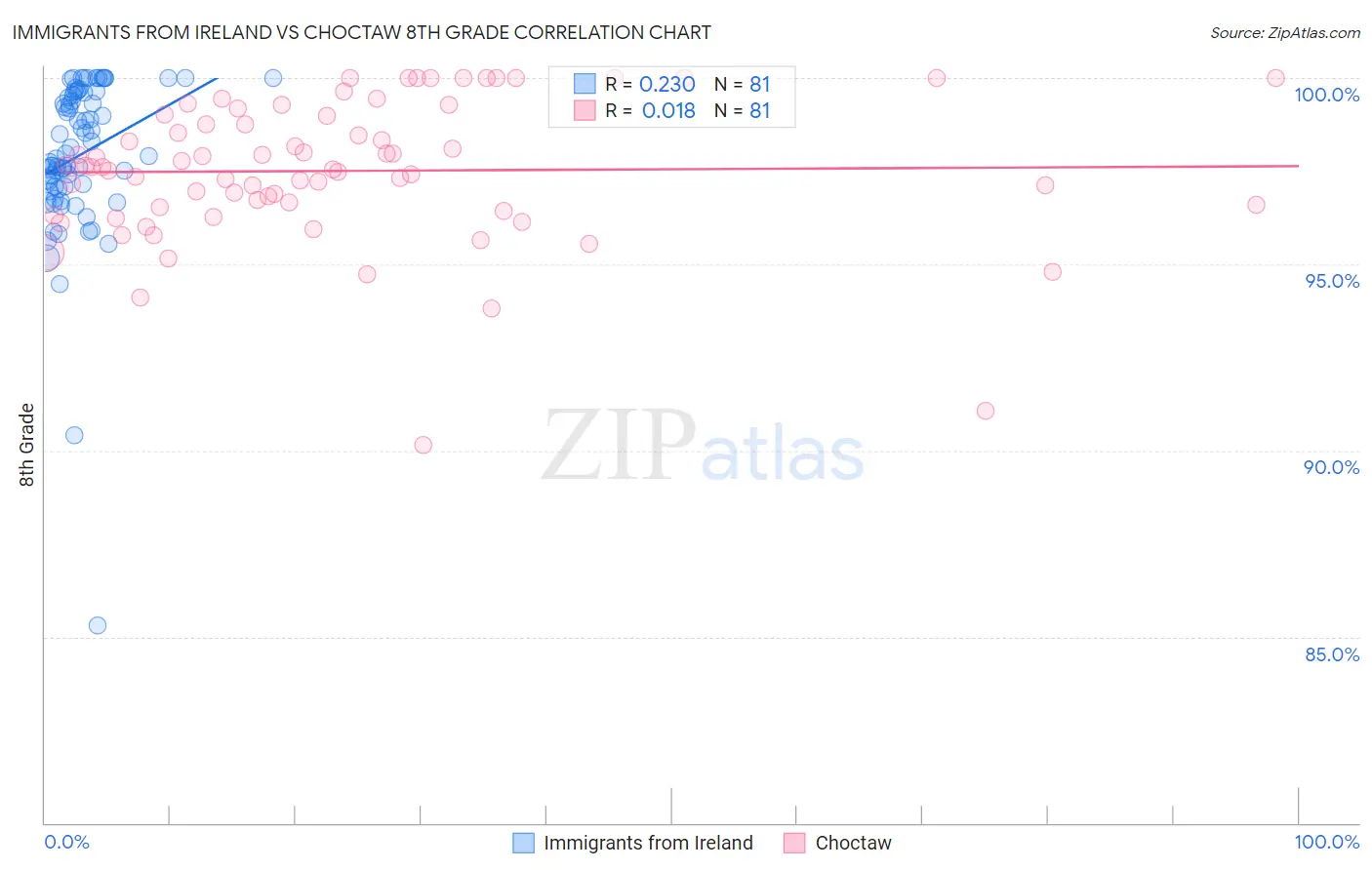 Immigrants from Ireland vs Choctaw 8th Grade Correlation Chart