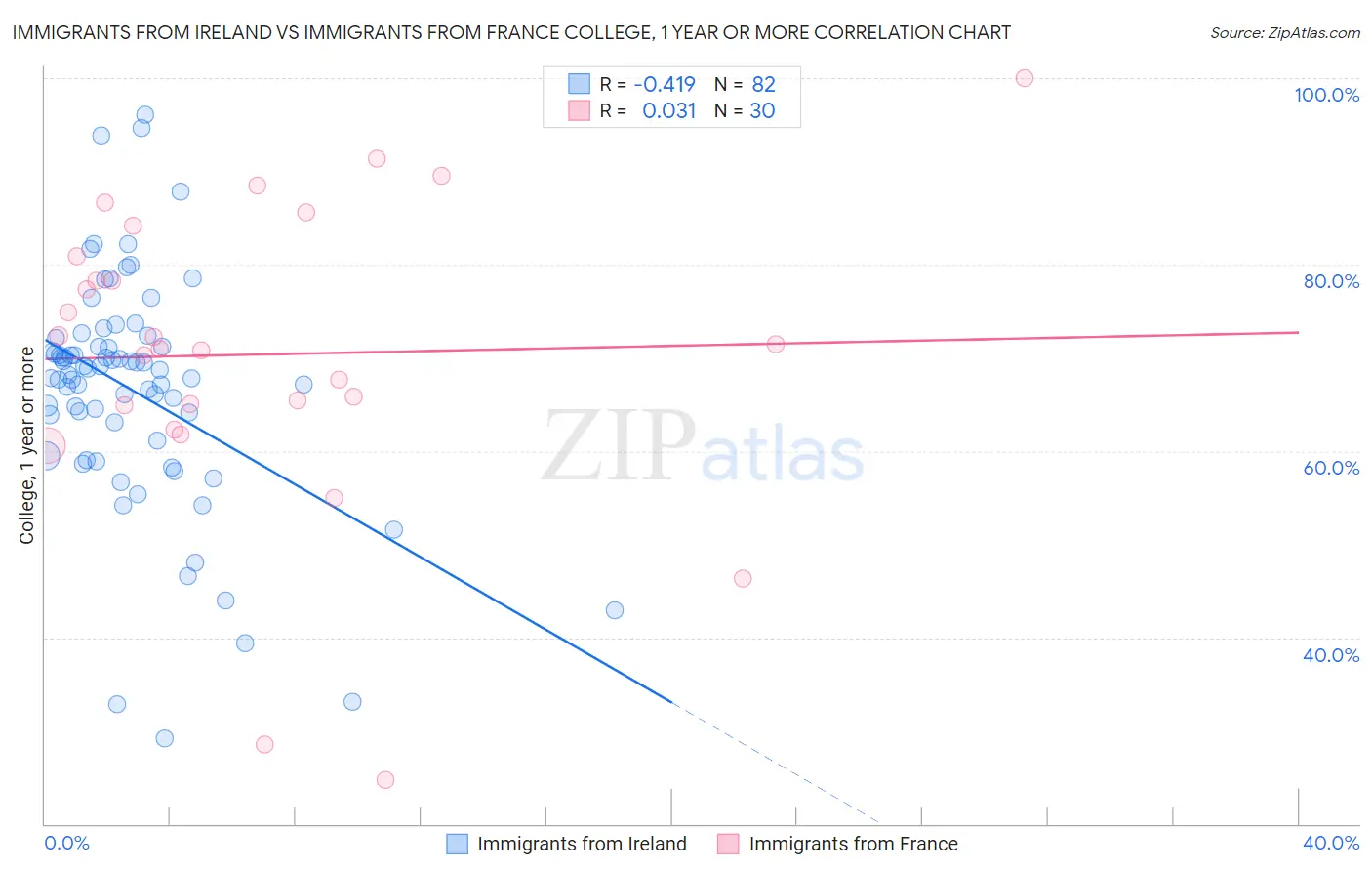 Immigrants from Ireland vs Immigrants from France College, 1 year or more Correlation Chart