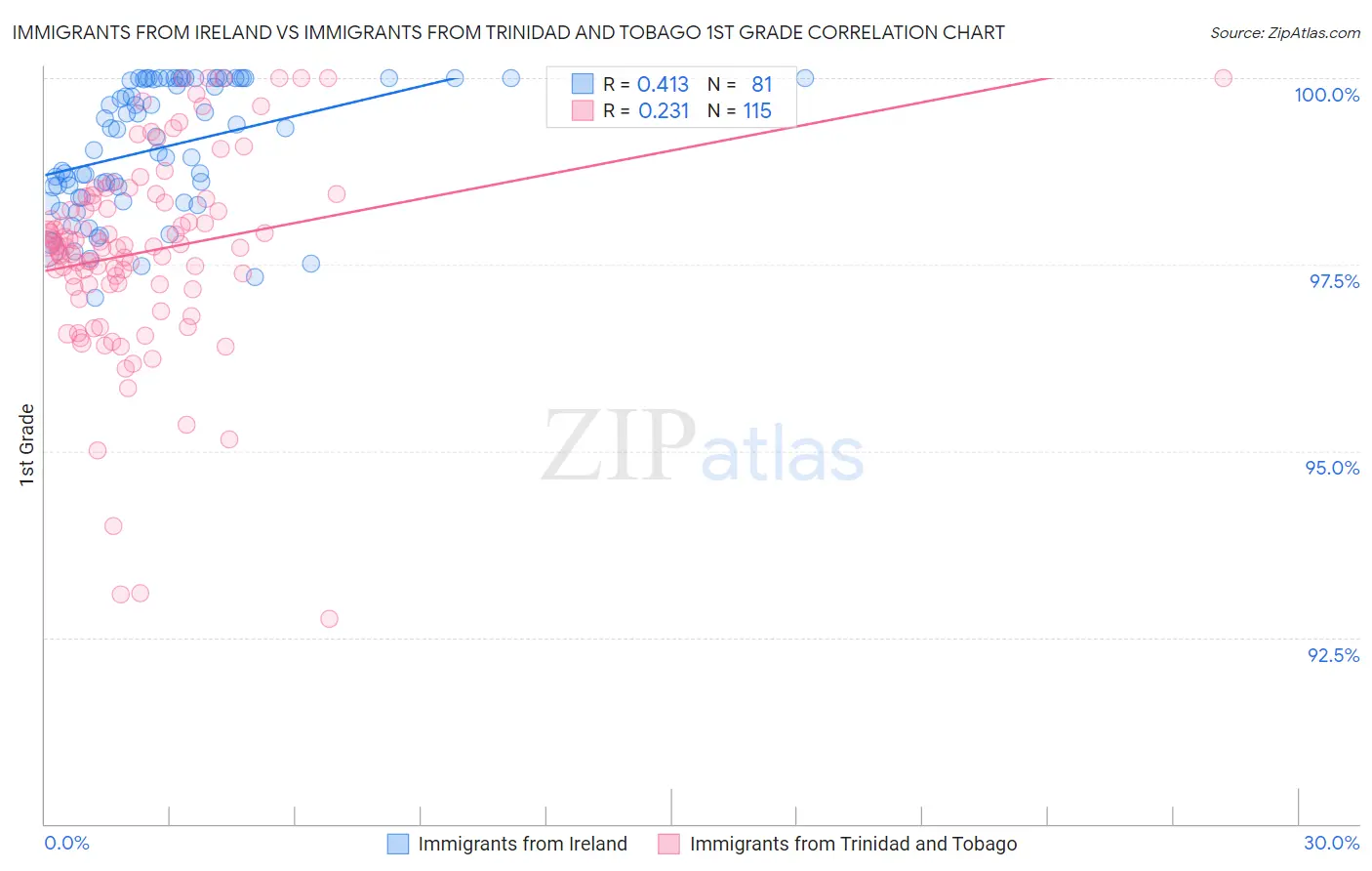 Immigrants from Ireland vs Immigrants from Trinidad and Tobago 1st Grade Correlation Chart