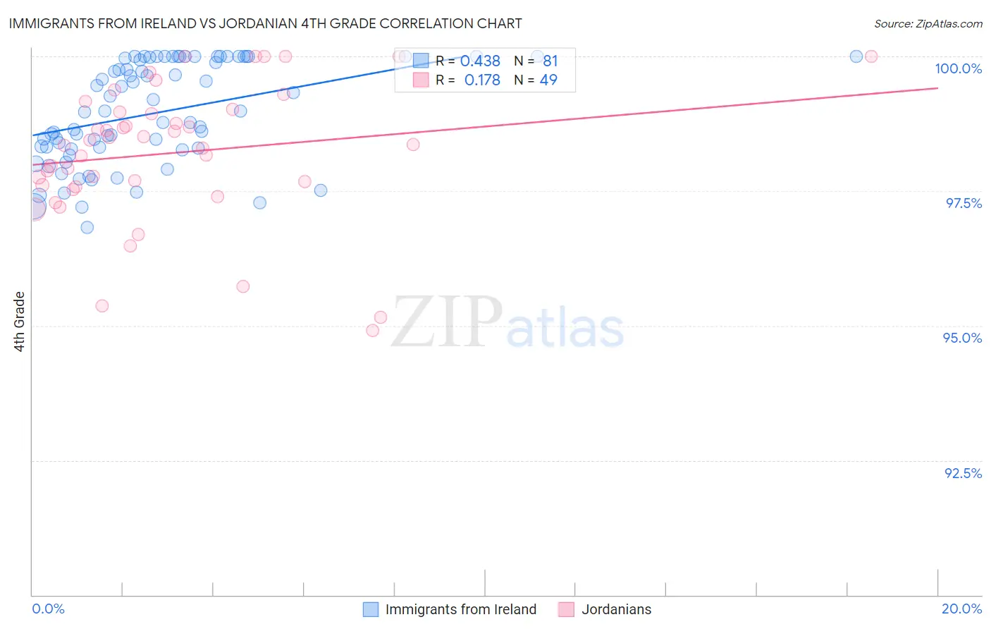 Immigrants from Ireland vs Jordanian 4th Grade Correlation Chart