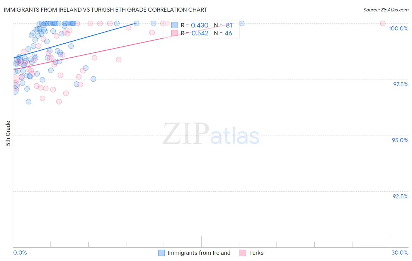 Immigrants from Ireland vs Turkish 5th Grade Correlation Chart