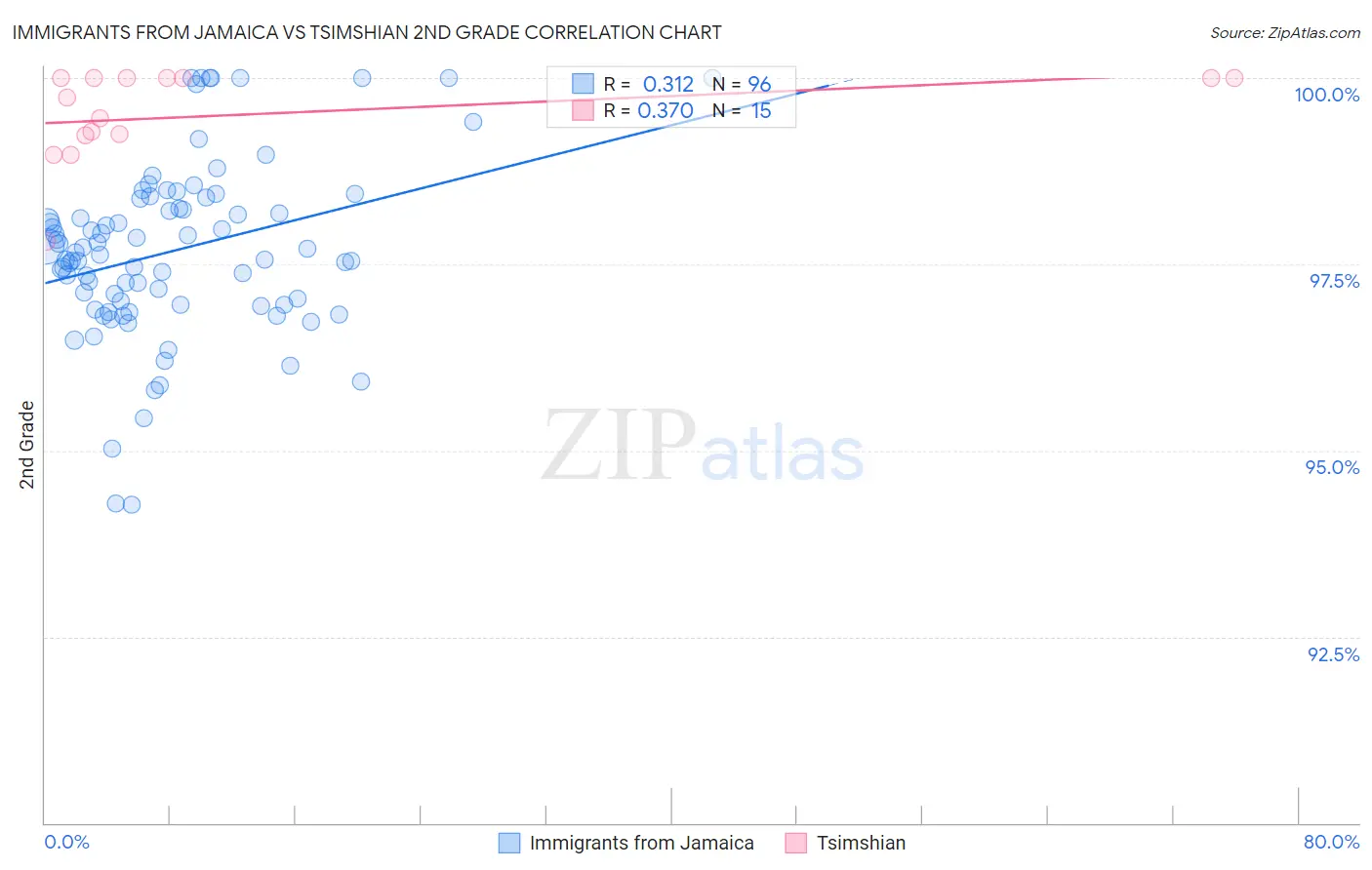 The statistical analysis conducted on geographies consisting of 301,830,081 people shows a mild positive correlation between the proportion of Immigrants from Jamaica and percentage of population with at least 2nd grade education in the United States with a correlation coefficient (R) of 0.312 and weighted average of 97.4%. Similarly, the statistical analysis conducted on geographies consisting of 15,626,544 people shows a mild positive correlation between the proportion of Tsimshian and percentage of population with at least 2nd grade education in the United States with a correlation coefficient (R) of 0.370 and weighted average of 98.8%, a difference of 1.5%.