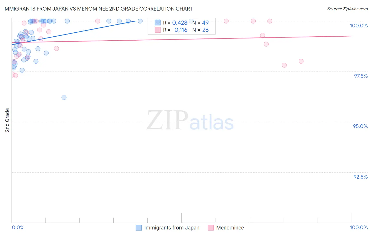 In terms of 2nd grade, the demographic groups most similar to Immigrants from Japan are Immigrants from Zimbabwe (98.1%, a difference of 0.0%), Lebanese (98.1%, a difference of 0.0%), Iroquois (98.1%, a difference of 0.0%), Syrian (98.1%, a difference of 0.0%), and Okinawan (98.1%, a difference of 0.010%). Similarly, the demographic groups most similar to Menominee are Immigrants from Zimbabwe (98.1%, a difference of 0.0%), Lebanese (98.1%, a difference of 0.0%), Iroquois (98.1%, a difference of 0.0%), Syrian (98.1%, a difference of 0.0%), and Okinawan (98.1%, a difference of 0.010%).