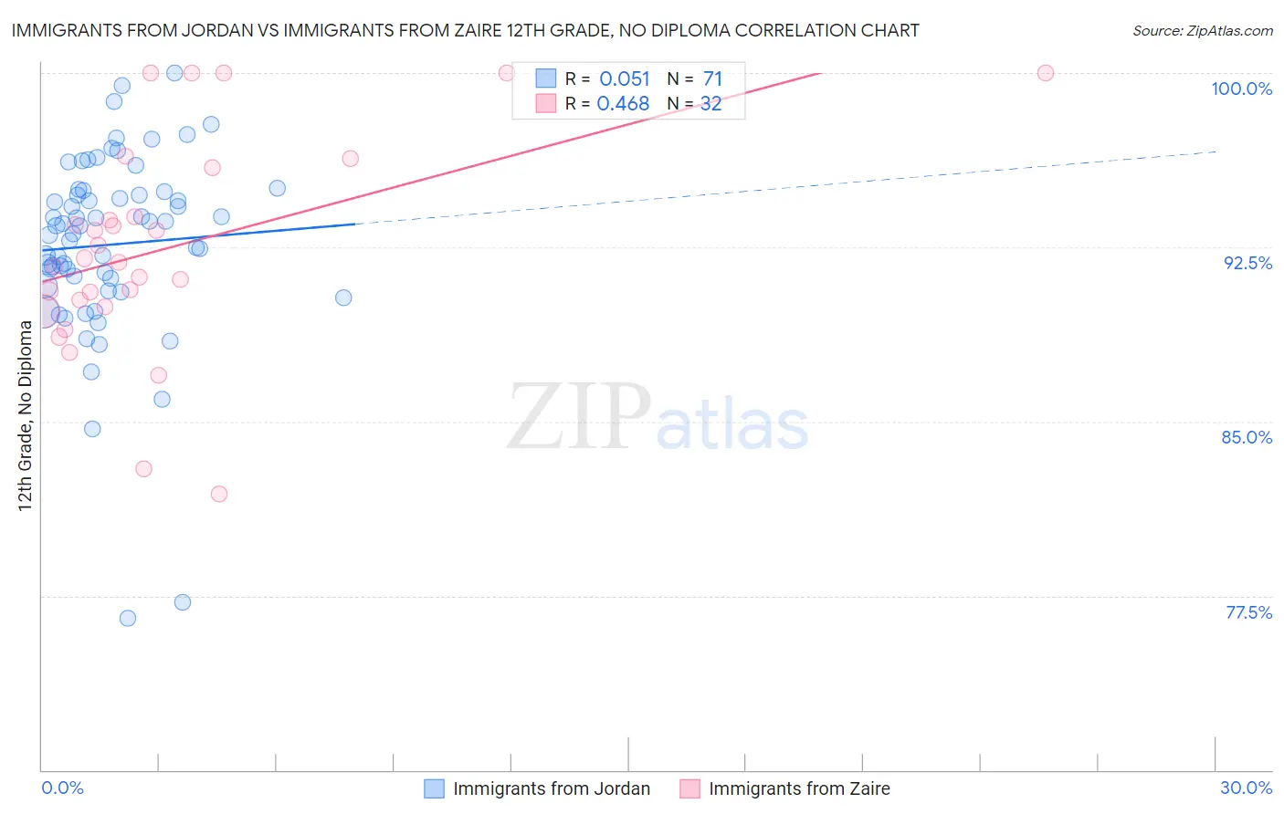 Immigrants from Jordan vs Immigrants from Zaire 12th Grade, No Diploma Correlation Chart