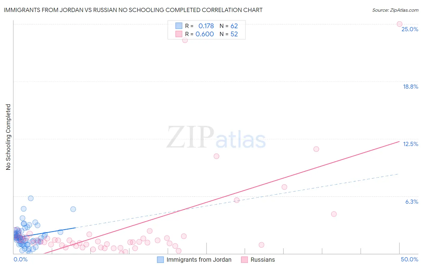 Immigrants from Jordan vs Russian No Schooling Completed Correlation Chart