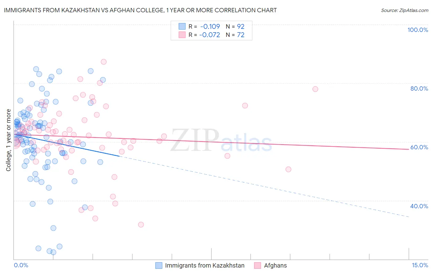 Immigrants from Kazakhstan vs Afghan College, 1 year or more Correlation Chart