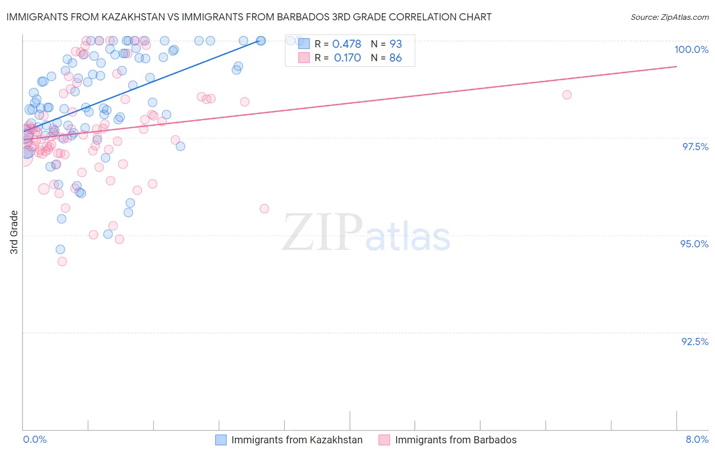 Immigrants from Kazakhstan vs Immigrants from Barbados 3rd Grade Correlation Chart