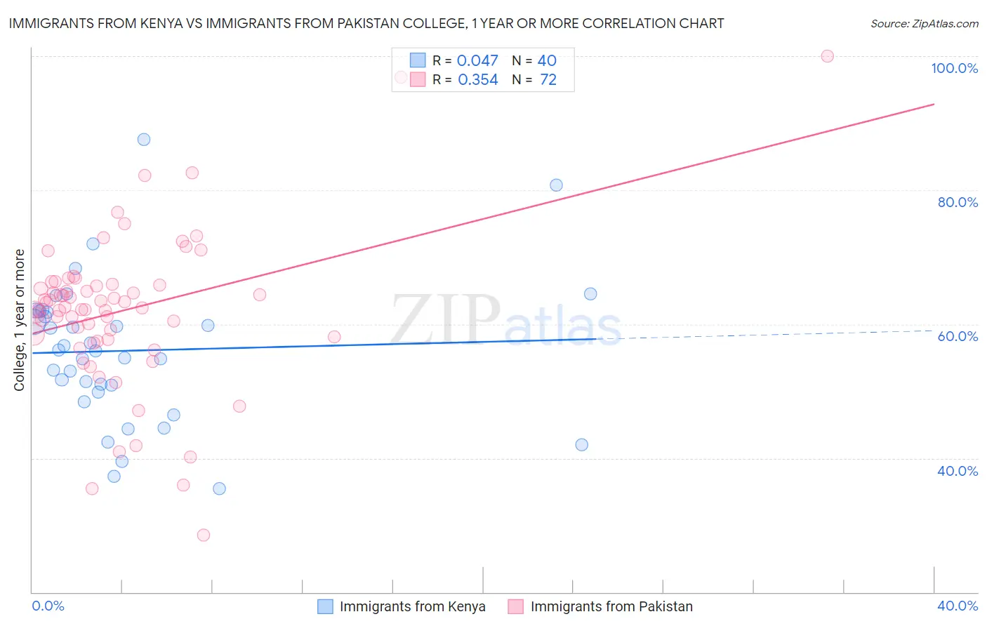 Immigrants from Kenya vs Immigrants from Pakistan College, 1 year or more Correlation Chart