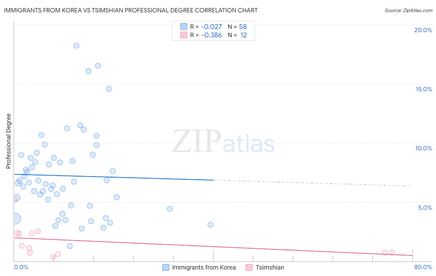 Immigrants from Korea vs Tsimshian Professional Degree Correlation Chart