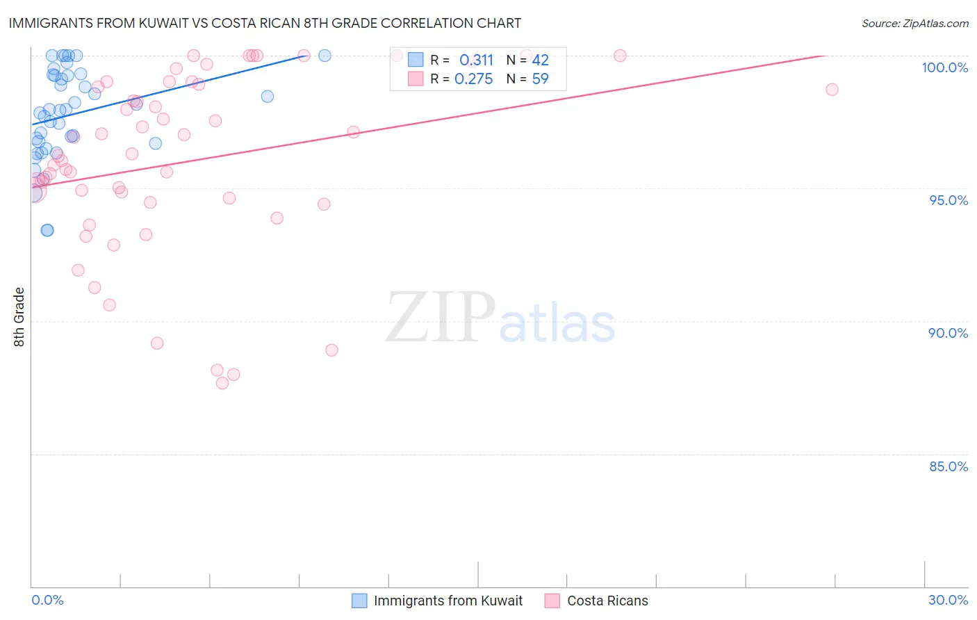 Immigrants from Kuwait vs Costa Rican 8th Grade Correlation Chart