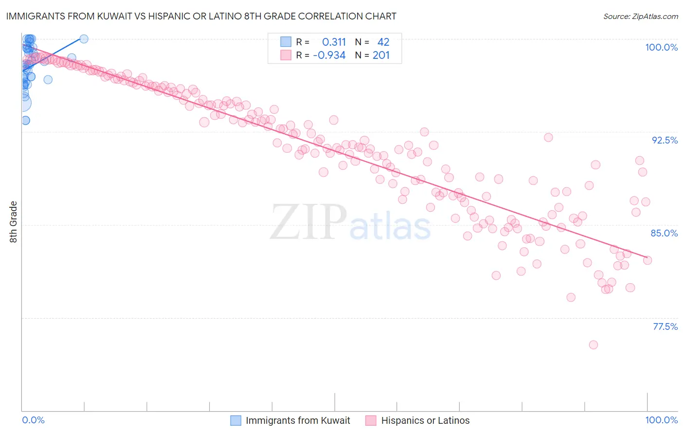 Immigrants from Kuwait vs Hispanic or Latino 8th Grade Correlation Chart