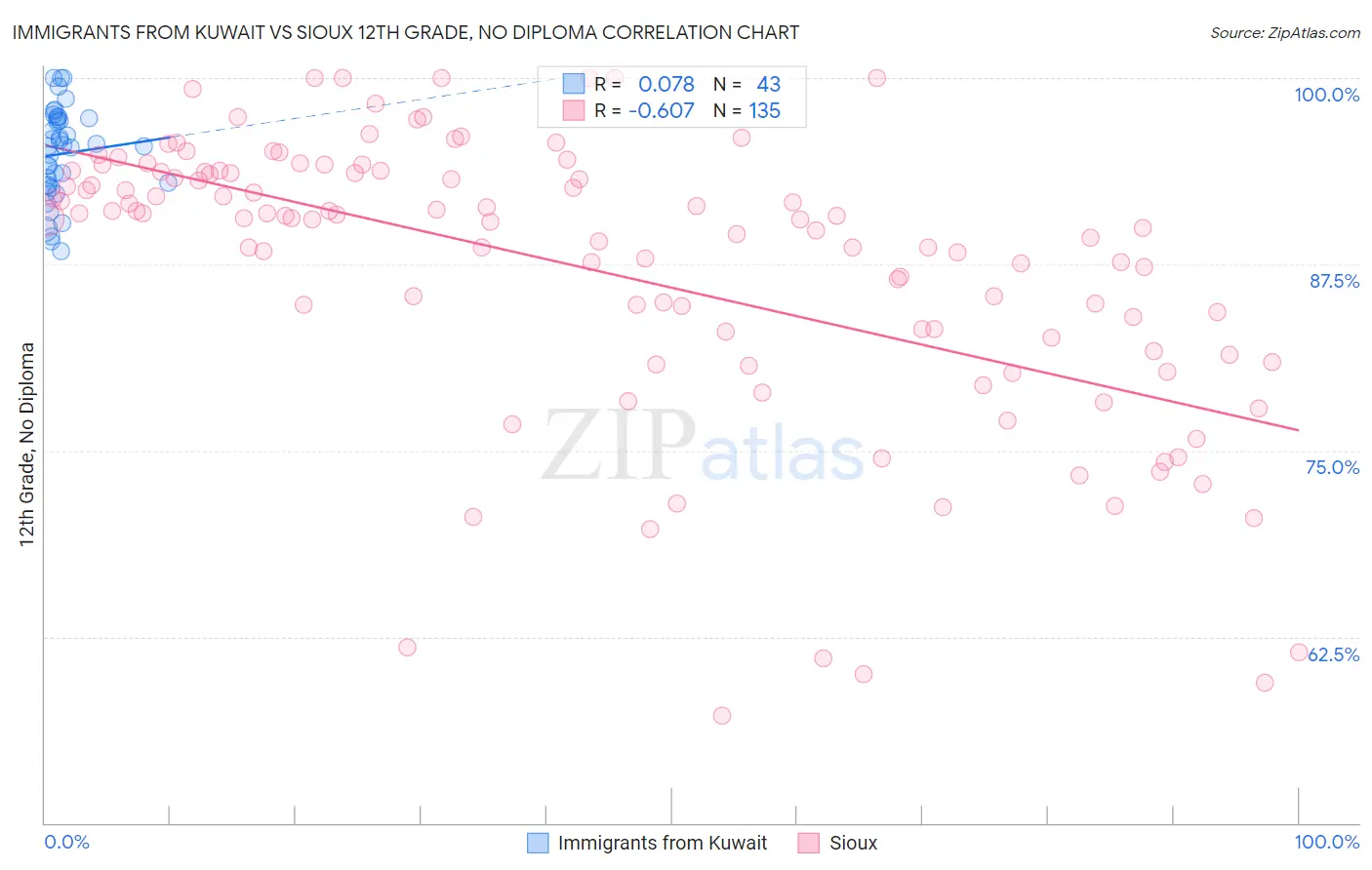 Immigrants from Kuwait vs Sioux 12th Grade, No Diploma Correlation Chart