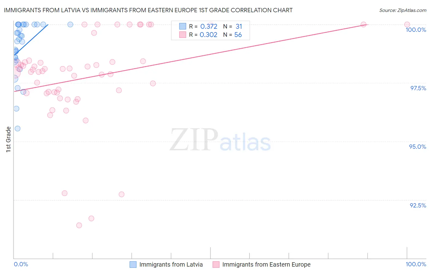 Immigrants from Latvia vs Immigrants from Eastern Europe 1st Grade Correlation Chart