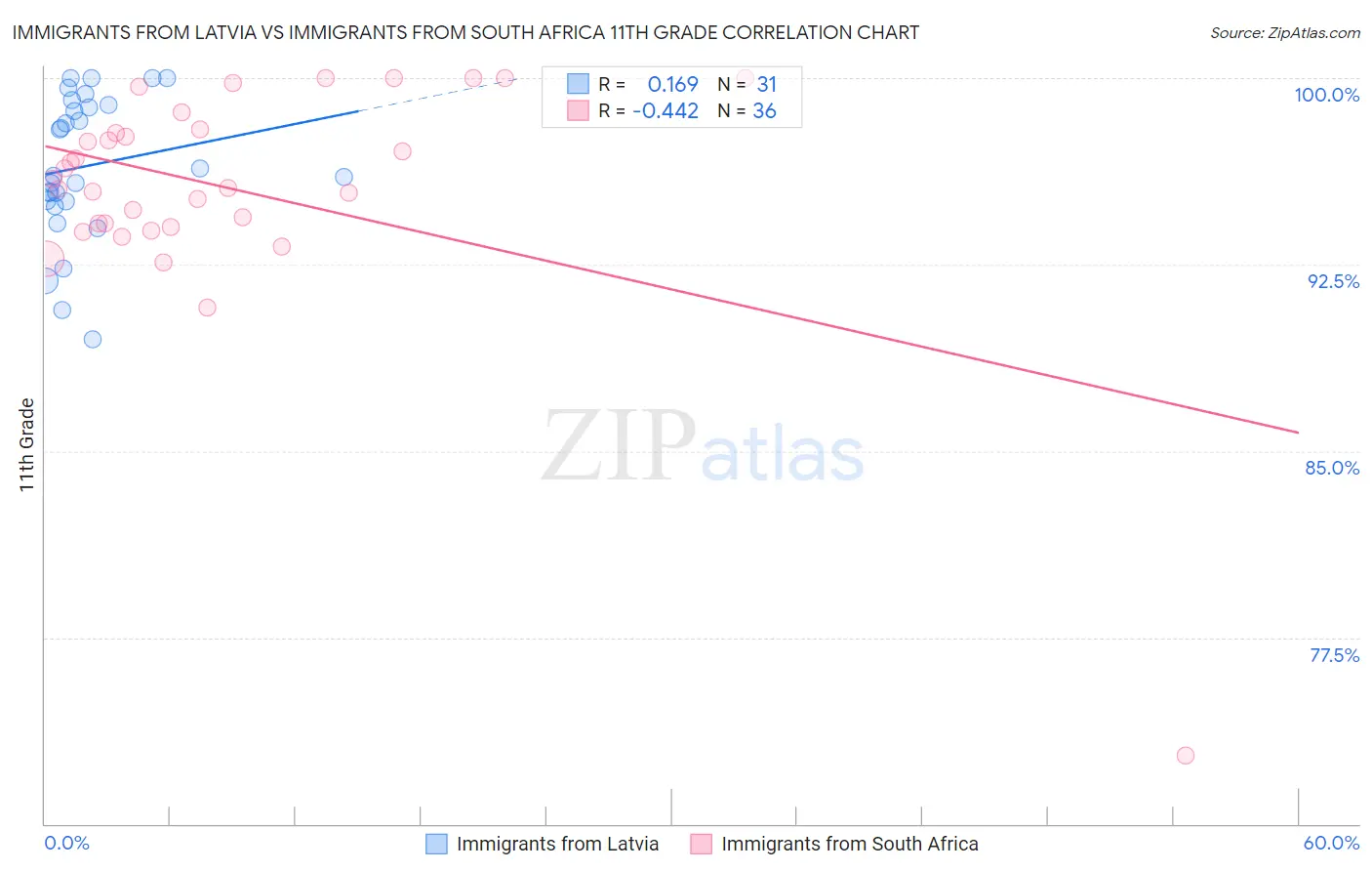Immigrants from Latvia vs Immigrants from South Africa 11th Grade Correlation Chart