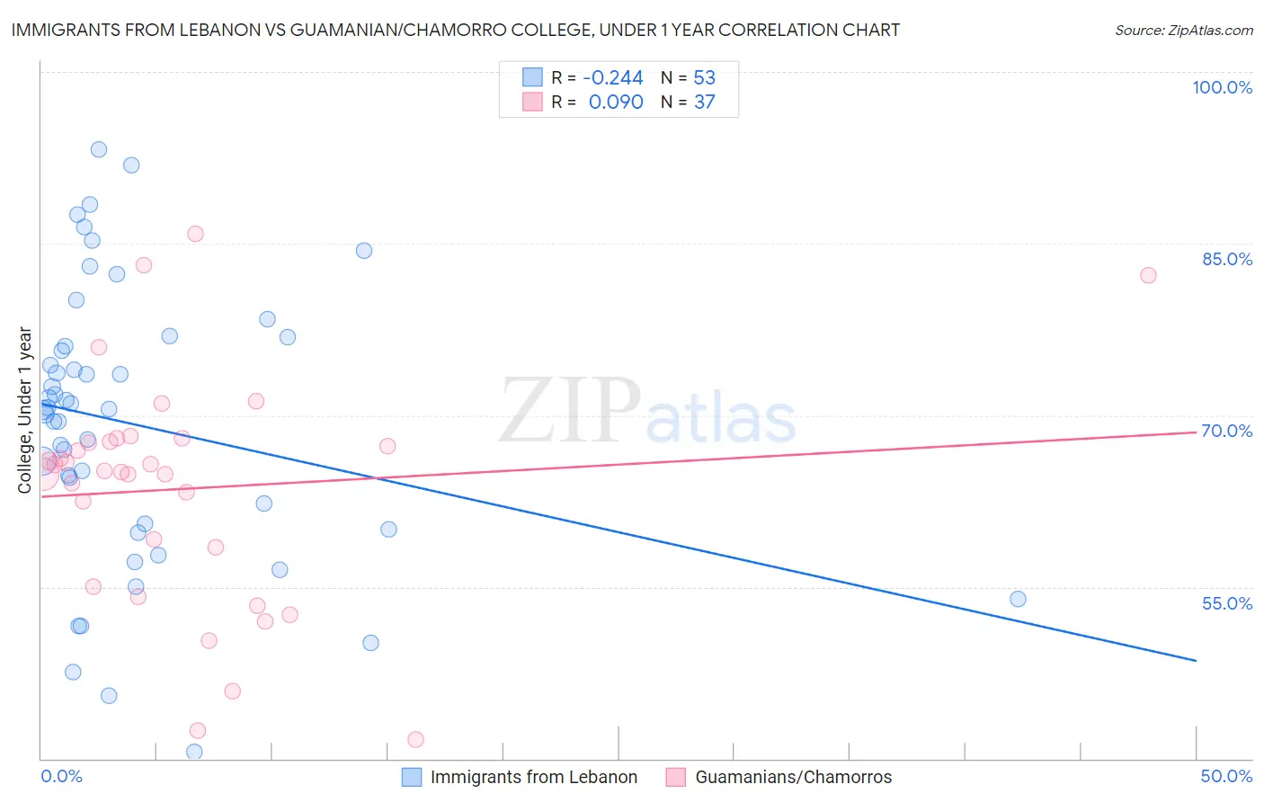 Immigrants from Lebanon vs Guamanian/Chamorro College, Under 1 year Correlation Chart