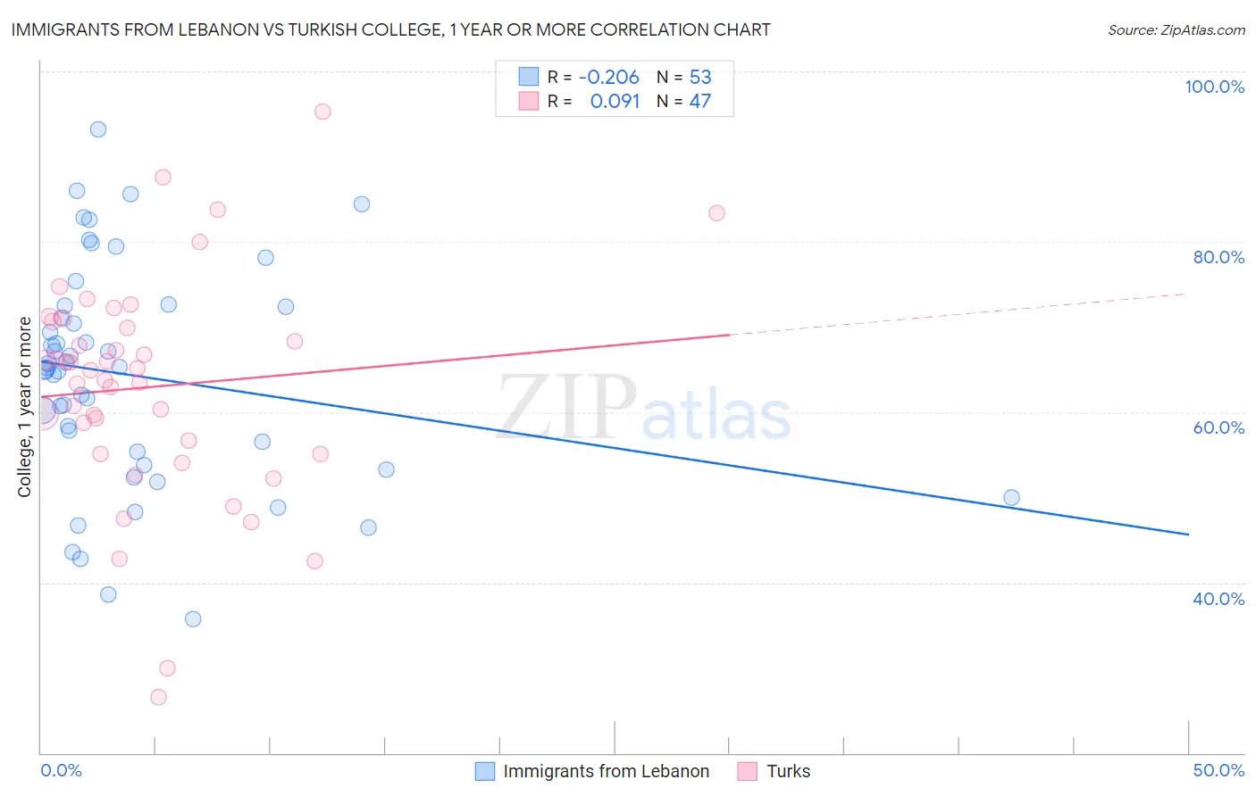 Immigrants from Lebanon vs Turkish College, 1 year or more Correlation Chart