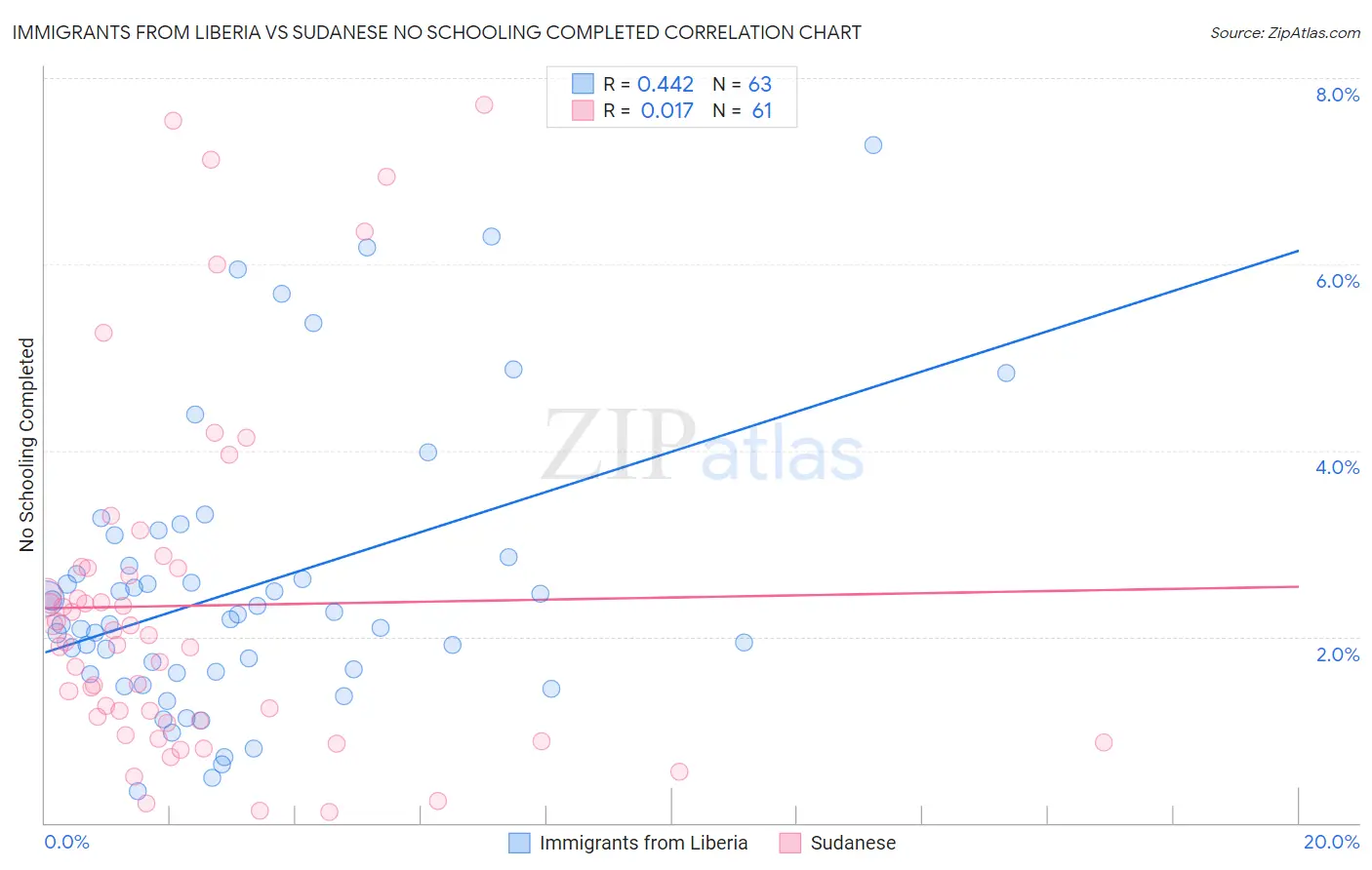 Immigrants from Liberia vs Sudanese No Schooling Completed Correlation Chart