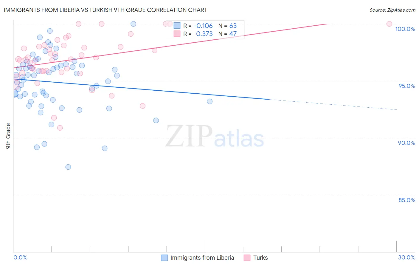 Immigrants from Liberia vs Turkish 9th Grade Correlation Chart