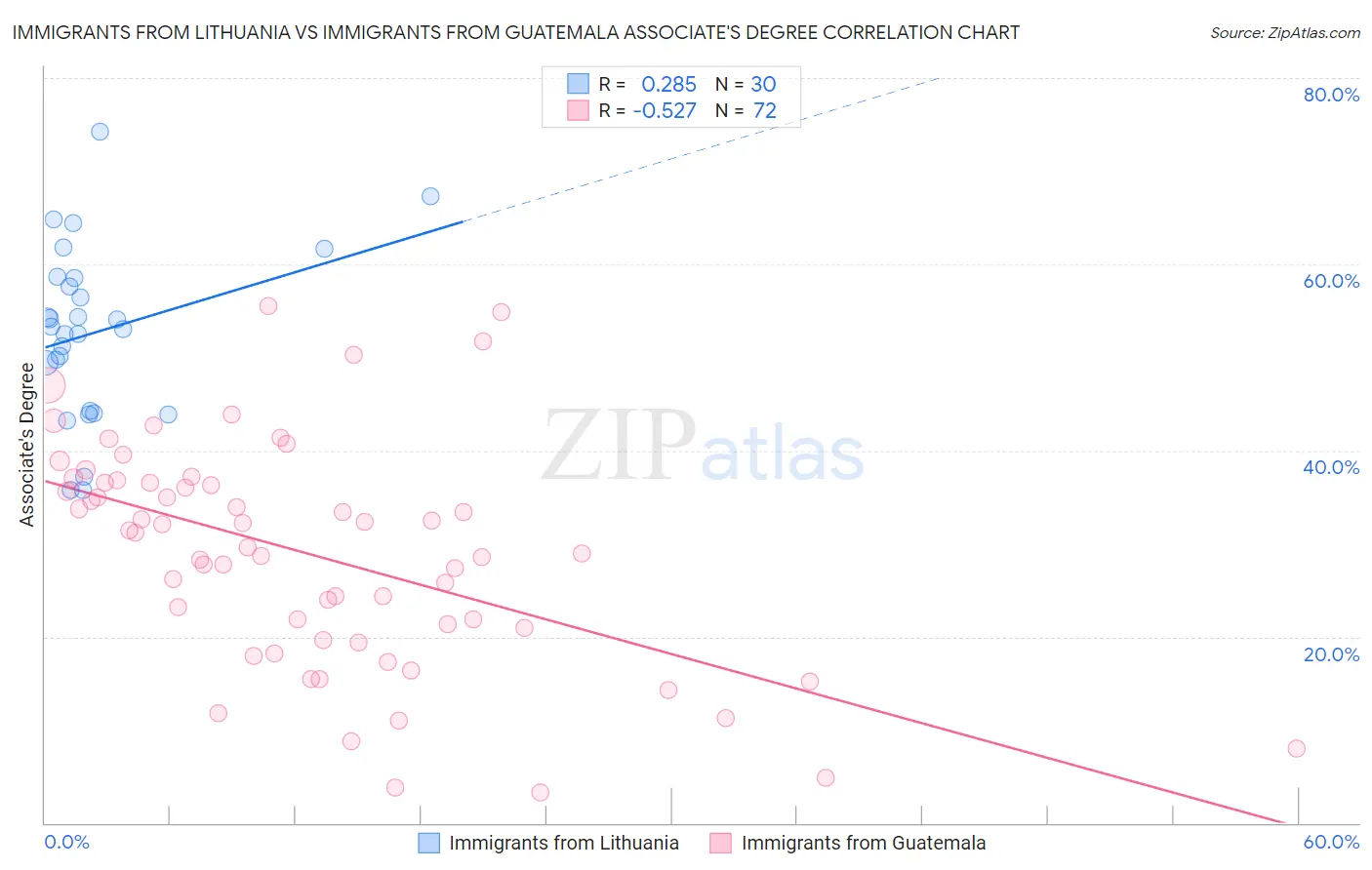 Immigrants from Lithuania vs Immigrants from Guatemala Associate's Degree Correlation Chart