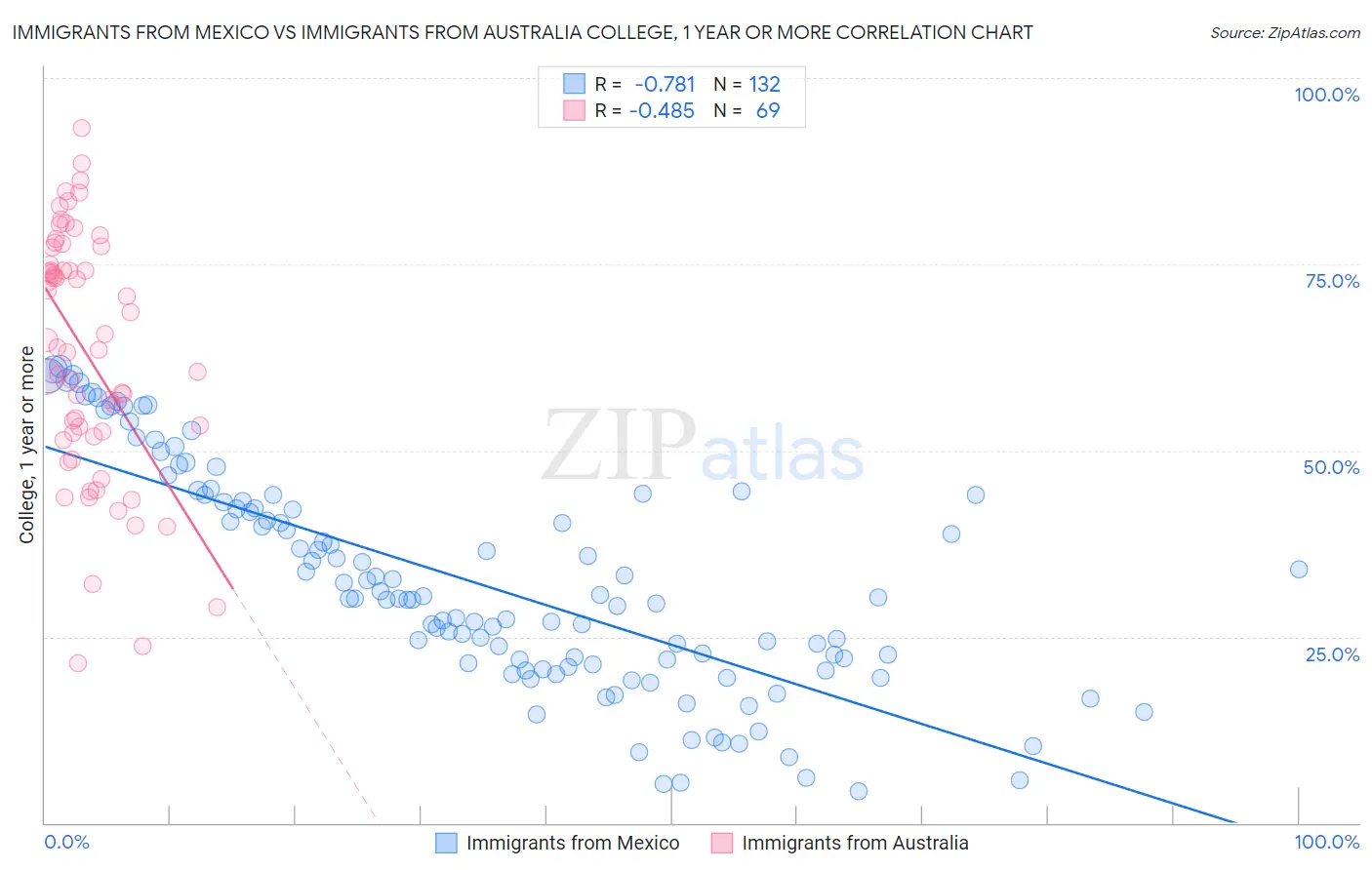 Immigrants from Mexico vs Immigrants from Australia College, 1 year or more Correlation Chart