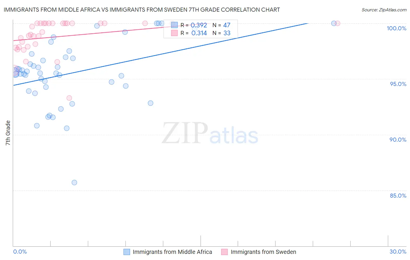 Immigrants from Middle Africa vs Immigrants from Sweden 7th Grade Correlation Chart