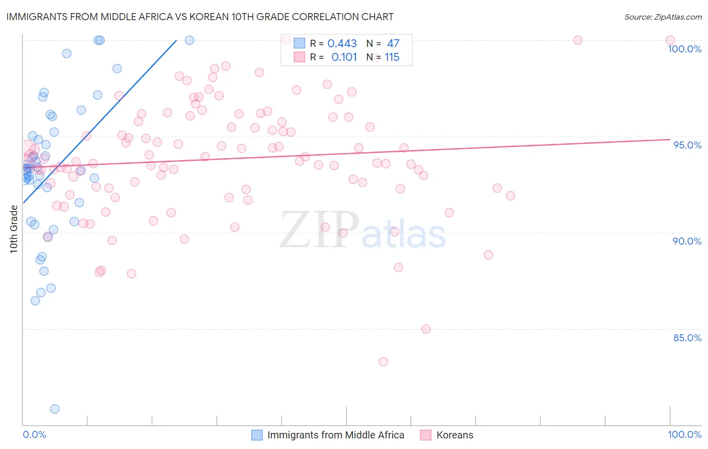 Immigrants from Middle Africa vs Korean 10th Grade Correlation Chart