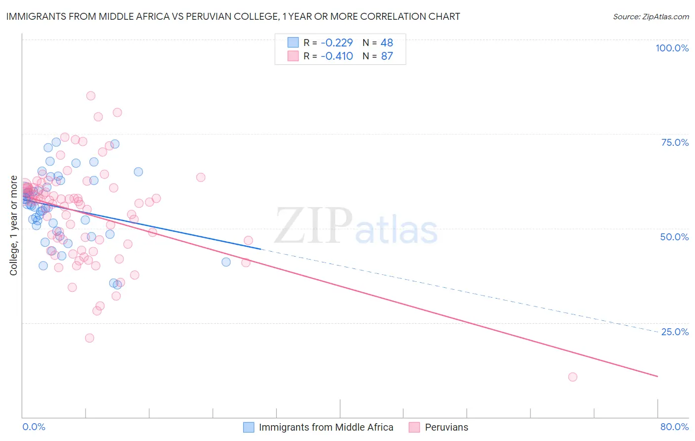 Immigrants from Middle Africa vs Peruvian College, 1 year or more Correlation Chart