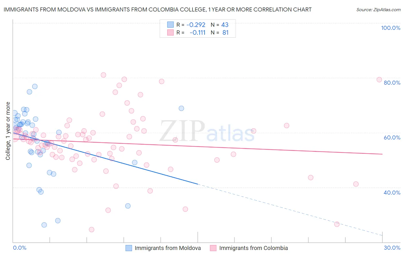 Immigrants from Moldova vs Immigrants from Colombia College, 1 year or more Correlation Chart